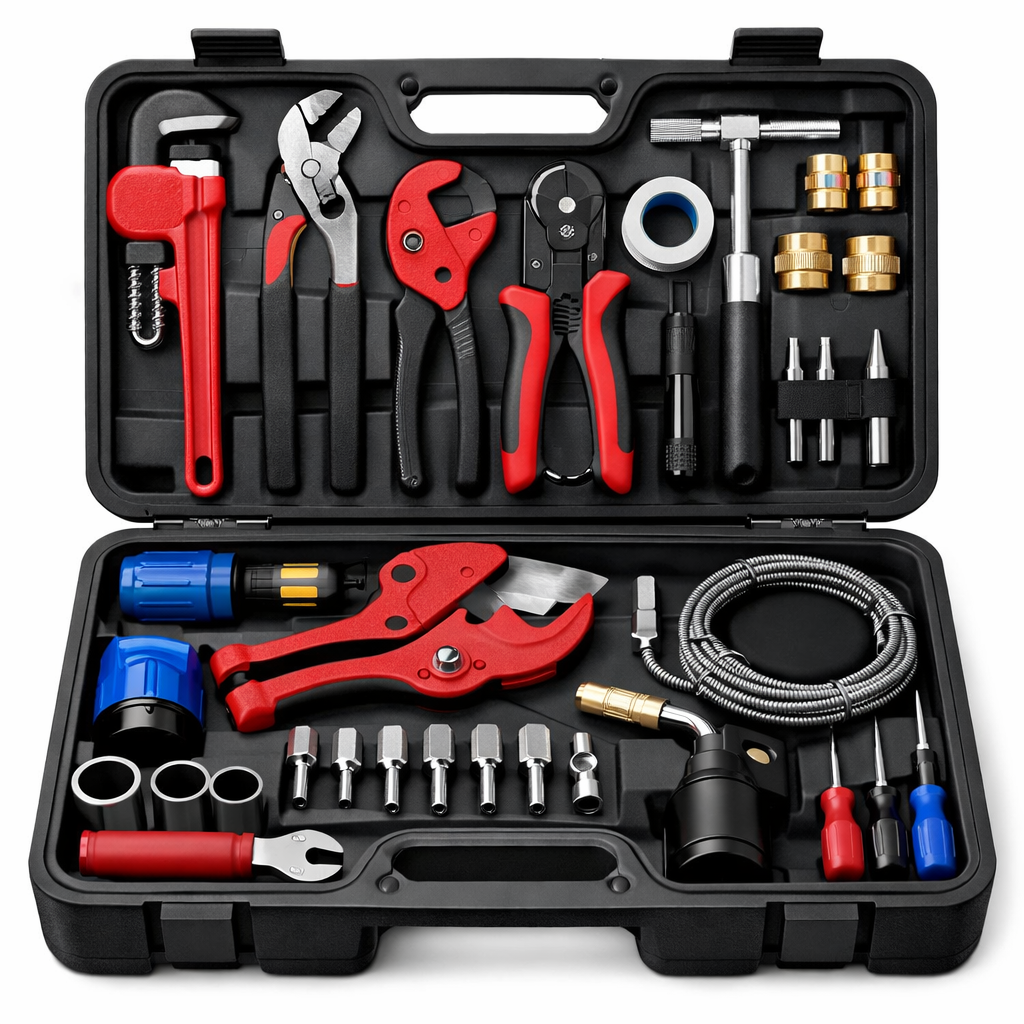 A complete plumbing tool kit designed for both beginners and professionals. This set includes essential tools needed for common plumbing repairs, installations, and maintenance, helping you work efficiently and confidently on any job.